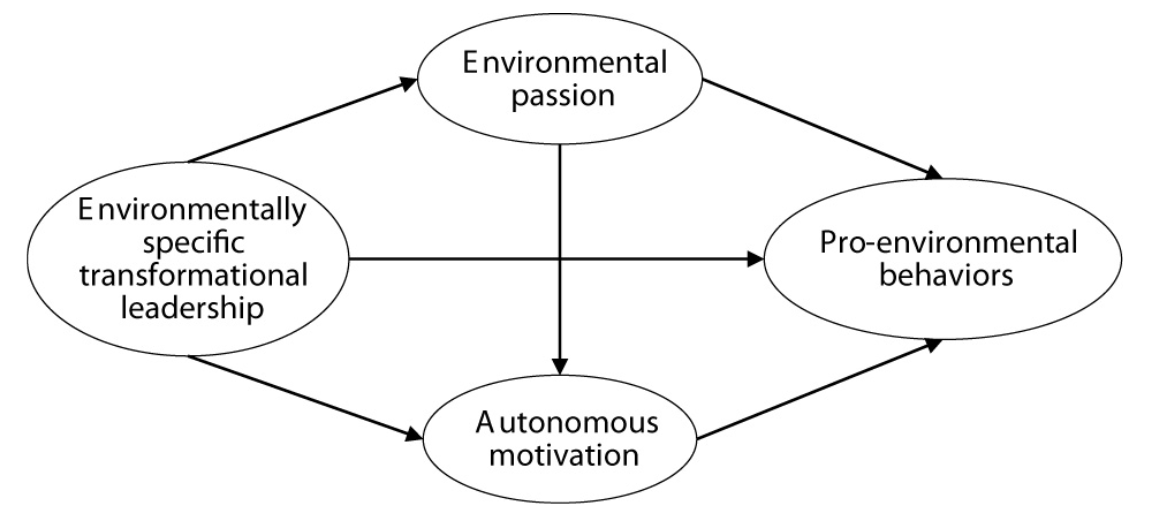 Abstract: Organizational management practices in promoting sustainable development of the ecological environment are becoming a crucial way for enterprises to gain competitive advantages. However, whether the goal of such practices can be achieved depends on employees’ perception of environmental problems and the way they act. Therefore, it is important to stimulate employees’ pro-environment behaviors through management activities. Building on affective events theory and self-determination theory, we examined the effect of environmentally specific transformational leadership on employees’ pro-environmental behaviors (PEBs), as well as the potential mediating effects of environmental passion and autonomous motivation. A cross-sectional survey was conducted among 214 employees in China. Structural equation modeling was performed to test the theory-driven models. The results showed that environmentally specific transformational leadership positively predicted employees’ PEBs, and that environmental passion and autonomous motivation mediated this relationship, respectively. Furthermore, multiple-mediating testing results showed that environmental passion and autonomous motivation played sequential mediating roles in the link of environmentally specific transformational leadership to PEBs. This research unveiled environmental passion and autonomous motivation as underlying mechanisms that accounted for the link between transformational leadership and PEBs.